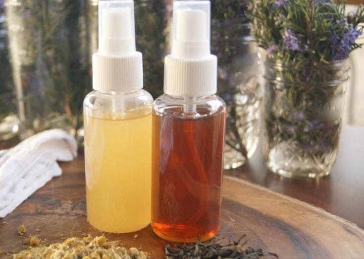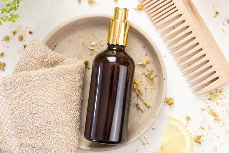 This essential oil hair spray keeps you from inhaling the noxious fumes of commercial hair sprays. Instead, you'll have a pleasant-smelling product made with chamomile and black tea that cleans, protects, and nourishes your hair. It also helps repair split ends and restore luster and shine.